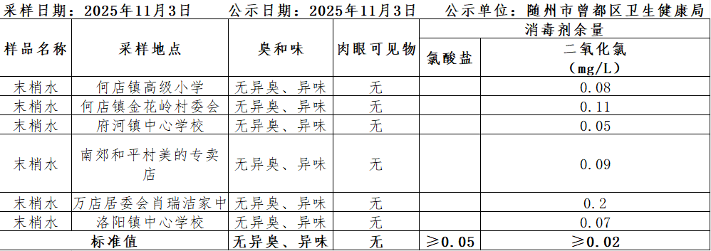 2025年11月3日曾都區鎮級生活飲用水衛生監測結果公示