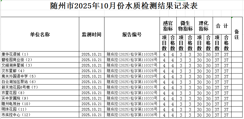 2025年10月城區(qū)飲用水檢測結(jié)果
