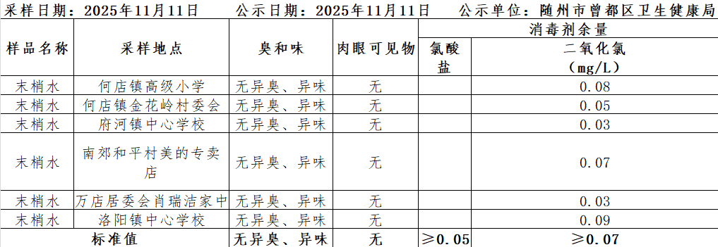 2025年11月11日曾都區鎮級生活飲用水衛生監測結果公示