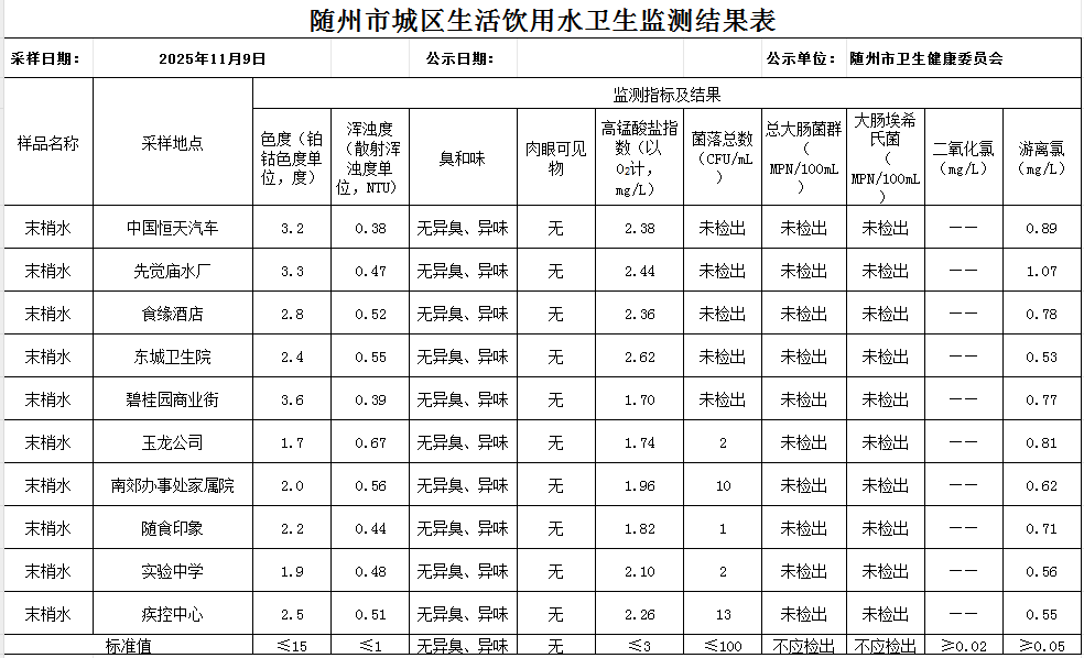 11.9隨州市城區(qū)生活飲用水衛(wèi)生監(jiān)測(cè)結(jié)果公示