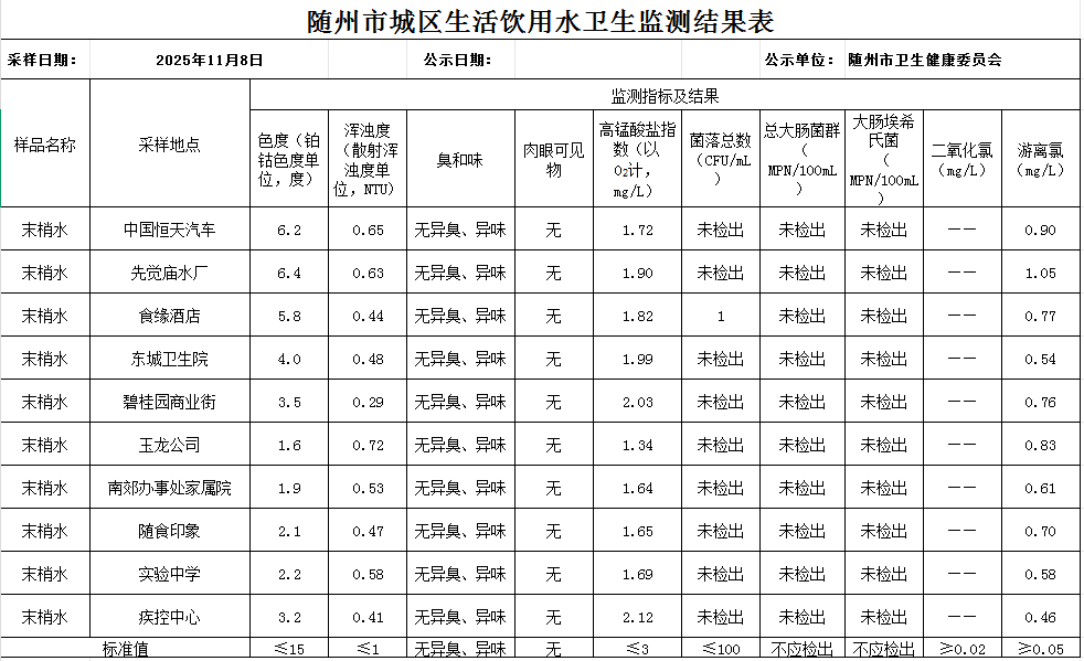 11.8隨州市城區(qū)生活飲用水衛(wèi)生監(jiān)測結(jié)果公示