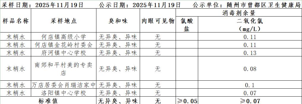 2025年11月19日曾都區鎮級生活飲用水衛生監測結果公示