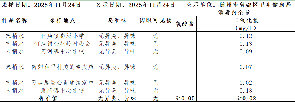2025年11月24日曾都區(qū)鎮(zhèn)級(jí)生活飲用水衛(wèi)生監(jiān)測(cè)結(jié)果公示