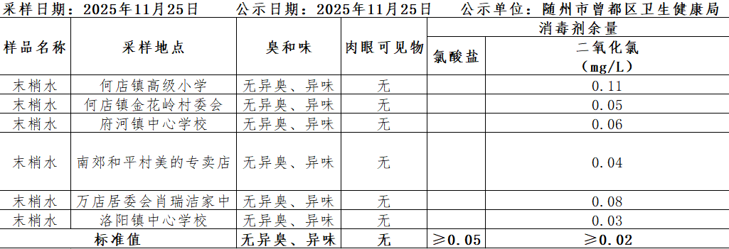 2025年11月25日曾都區鎮級生活飲用水衛生監測結果公示