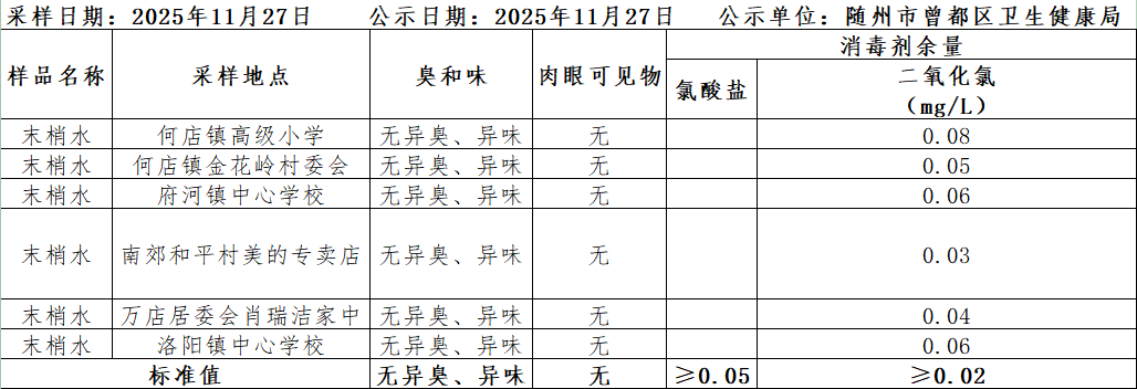 2025年11月27日曾都區(qū)鎮(zhèn)級生活飲用水衛(wèi)生監(jiān)測結(jié)果公示