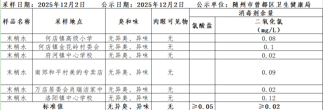 2025年12月2日曾都區鎮級生活飲用水衛生監測結果公示