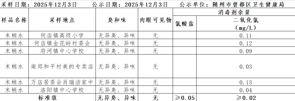 2025年12月3日曾都區鎮級生活飲用水衛生監測結果公示