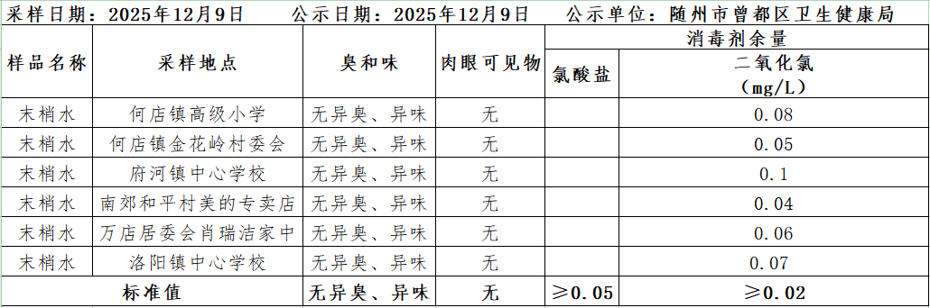 2025年12月9日曾都區(qū)鎮(zhèn)級(jí)生活飲用水衛(wèi)生監(jiān)測(cè)結(jié)果公示