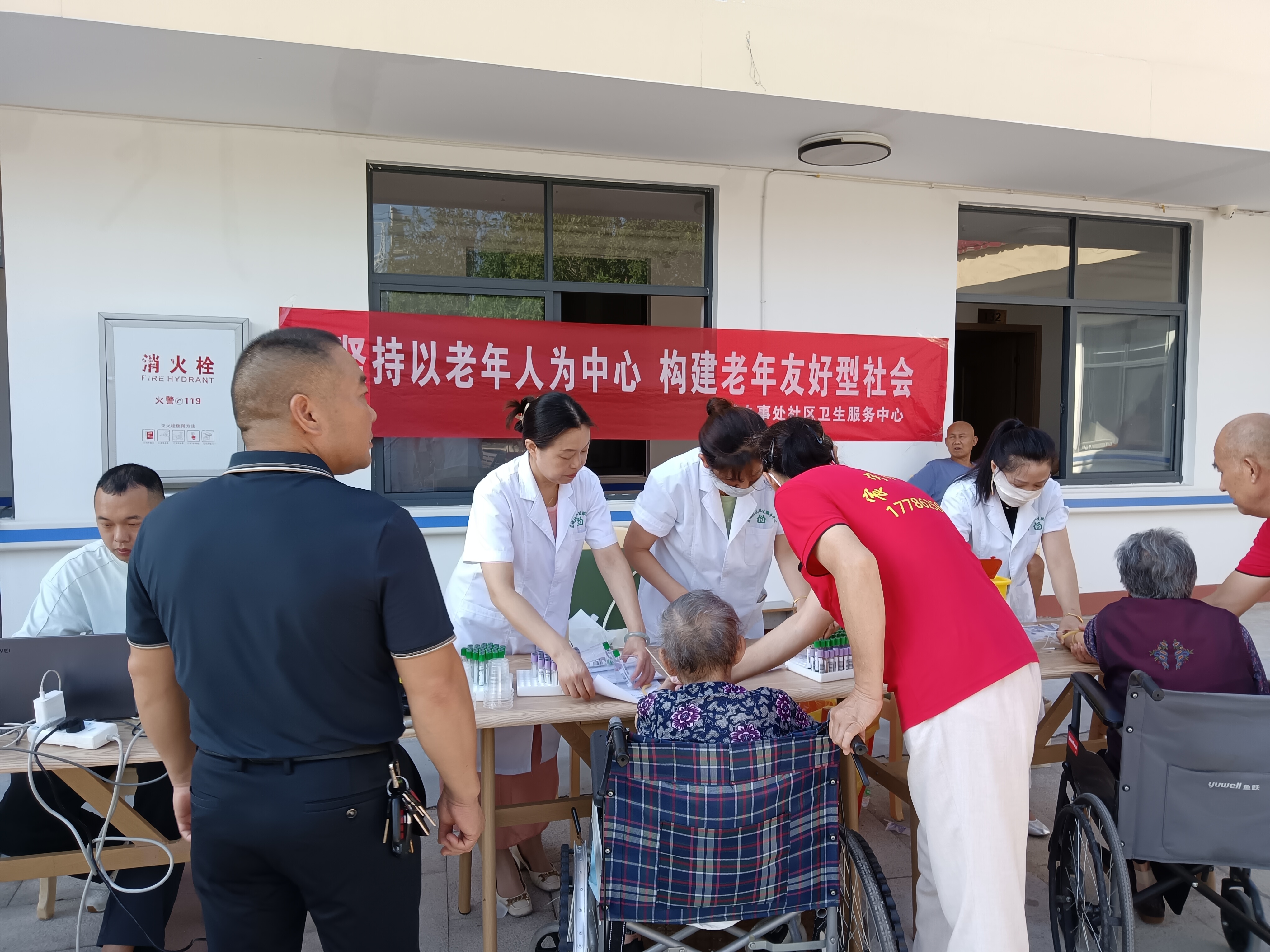 早晨7點,工作人員早早布置好場地、連接好網絡設備,細心引導老年人依次排隊,有序接受各項檢查。為減少老年人等待時間,避免因長時間等候引發低血糖等不適,醫務人員在護理員的配合下分組進行體檢,同時在自理區和失能區開展采血工作,隨后依次進行心電圖、B超等檢查。