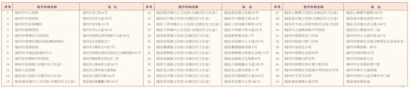 ?為保障隨縣參保群眾就醫購藥,維護參保群眾的合法權益。根據國務院《醫療保障基金使用監督管理條例》和《隨州市醫療保障定點醫療機構管理辦法(試行)》、《隨州市醫療保障定點零售藥店管理辦法(試行)》的規定,現對隨縣基本醫療保險定點醫藥機構進行公告。請隨縣參保人員選擇以下定點醫藥機構就醫購藥,在隨州統籌區內非定點醫藥機構產生的醫藥費用,醫療保險基金不予支付,請廣大參保群眾理解支持配合。