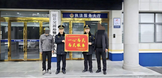 近日,一位外地司機及親屬專程來到隨縣交通運輸綜合執法大隊服務大廳,送來一塊印有“一心為民,為民服務”的錦匾,表達對大隊執法人員的感謝之情,彰顯了隨縣交通運輸執法者“不忘初心,一心為民”的執法理念。