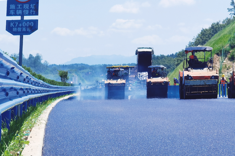 ?? 隨信高速是我市重點交通項目。連日來,武漢路橋等施工單位搶抓晴好天氣,加快推進路面攤鋪,力爭早日建成通車。圖為攤鋪瀝青面層。