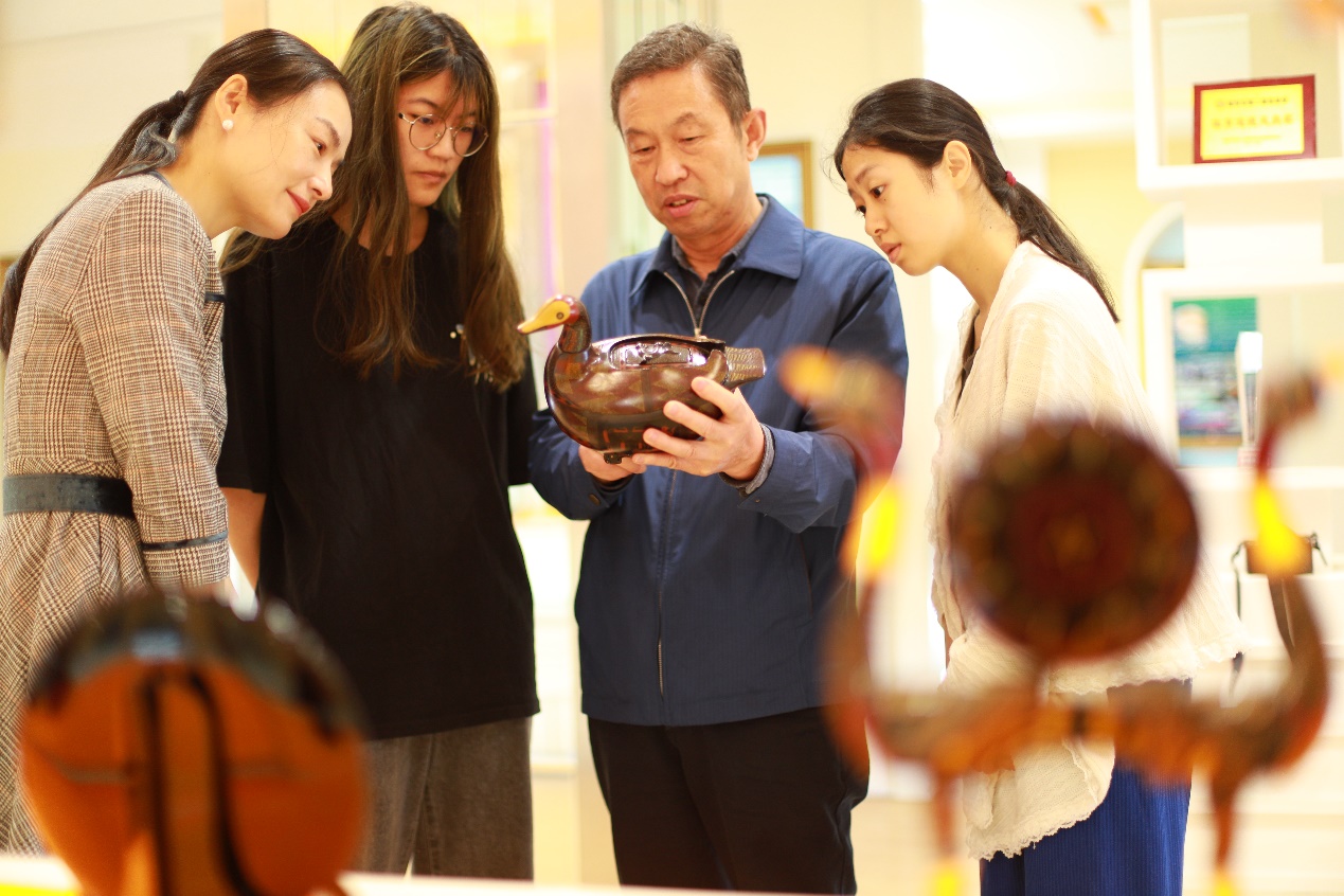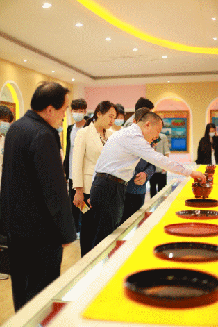 啟動儀式結束后,領導、老師和同學們來到隨州職院圖書館二樓校史陳列館觀看曾楚漆器作品展。隨州歷史悠久,是曾楚文化的發源地之一,1978年曾侯乙墓發掘出的大量漆器證明,隨州地區漆器髹飾的歷史,至少可追溯到兩千多年前。湖北省非遺傳承人祝成超帶來了他的團隊制作的鴛鴦漆盒、虎座鳳鳥懸鼓等精美漆器100多件,并現場講解展出漆器的制作技藝和文化內涵。當天下午,隨州職院抖音號還專場直播部分師生參觀曾楚漆器現場,受到3000人次觀看點贊和好評。