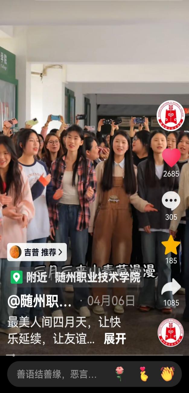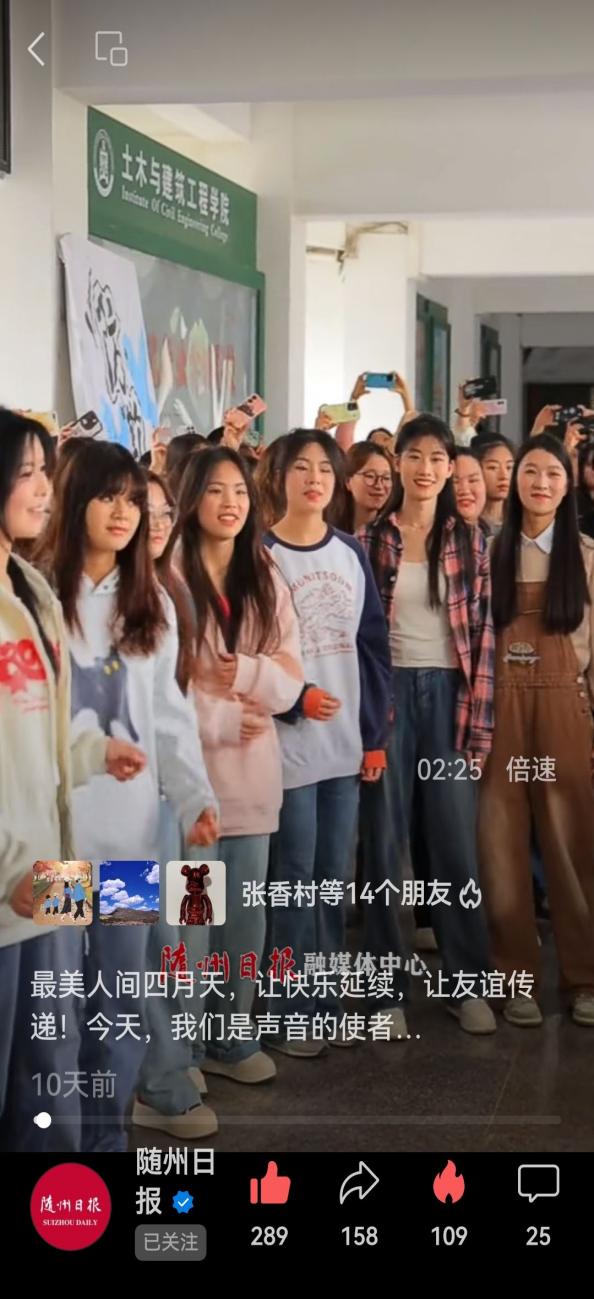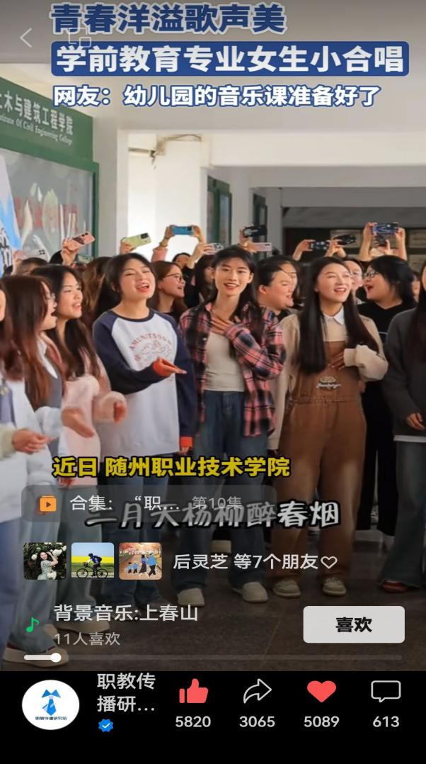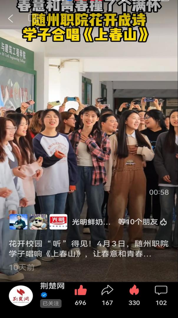 “二月天楊柳醉春煙,三月三來山青草漫漫,最美是人間四月的天……”。4月上旬,我校師生在校園合唱《上春山》短視頻先后在隨州職業技術學院官方抖音平臺、隨州日報視頻號、隨州社會全方位視頻號、荊楚網視頻號、職教傳播研究院視頻號等媒體平臺登載,短短三天就獲得了全網百萬+流量關注。