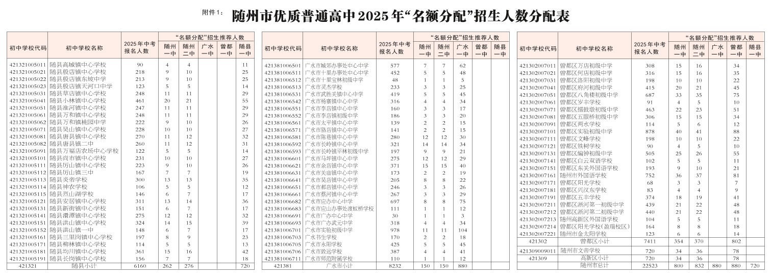 將優質普通高中2025年80%的招生計劃按學校招生范圍分配到隨縣、廣水市、曾都區、隨州高新區(名額分配數見附件1)。