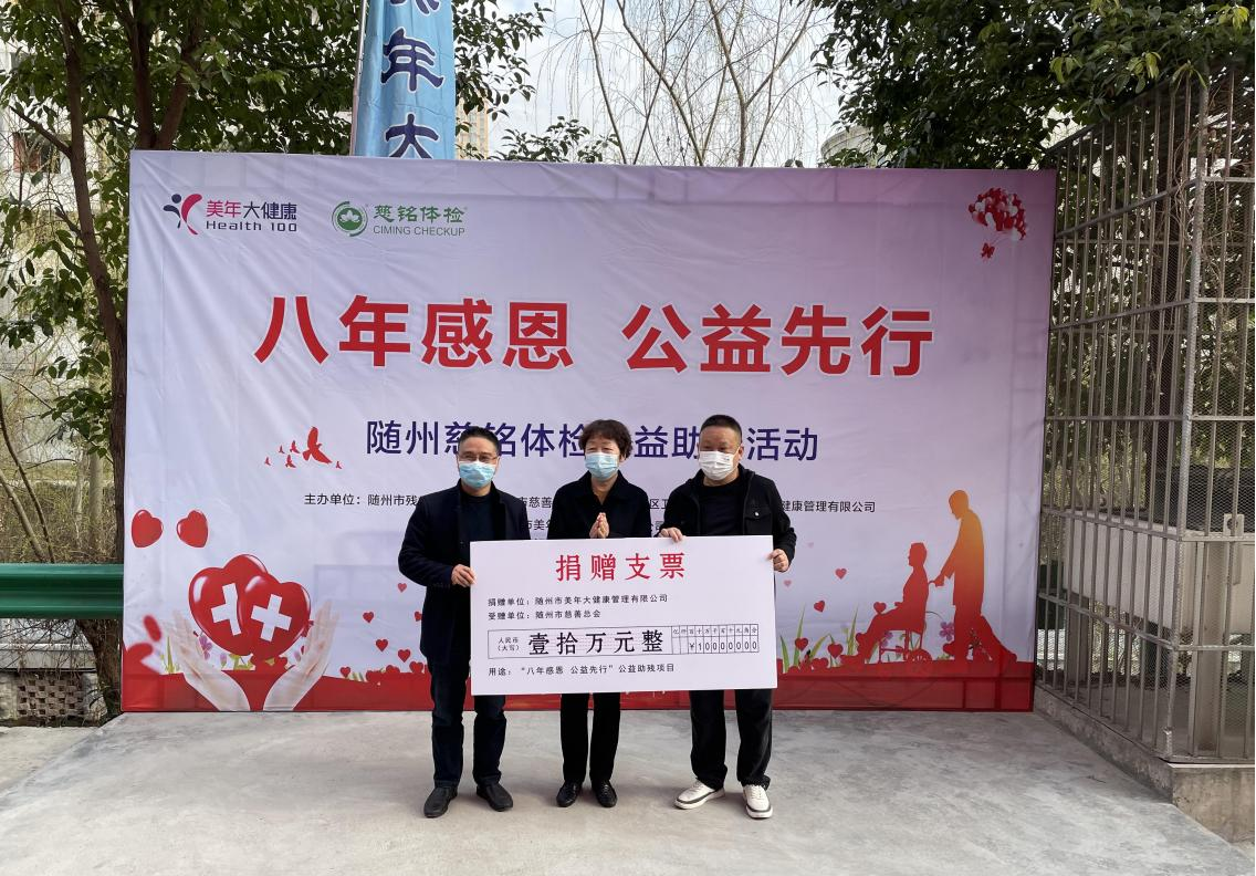 活動現(xiàn)場,隨州市美年大健康慈銘體檢董事長胡修龍向隨州市慈善總會捐贈10萬元助殘體檢經(jīng)費(fèi),慈善總會袁慧敏會長蒞臨現(xiàn)場接受捐贈。隨州市殘聯(lián)副理事長陳論嶺參加捐贈儀式并作熱情洋溢致辭,感謝慈銘體檢多年來一直積極參與扶殘助殘,用大愛回饋社會,擔(dān)當(dāng)和履行社會職責(zé)。