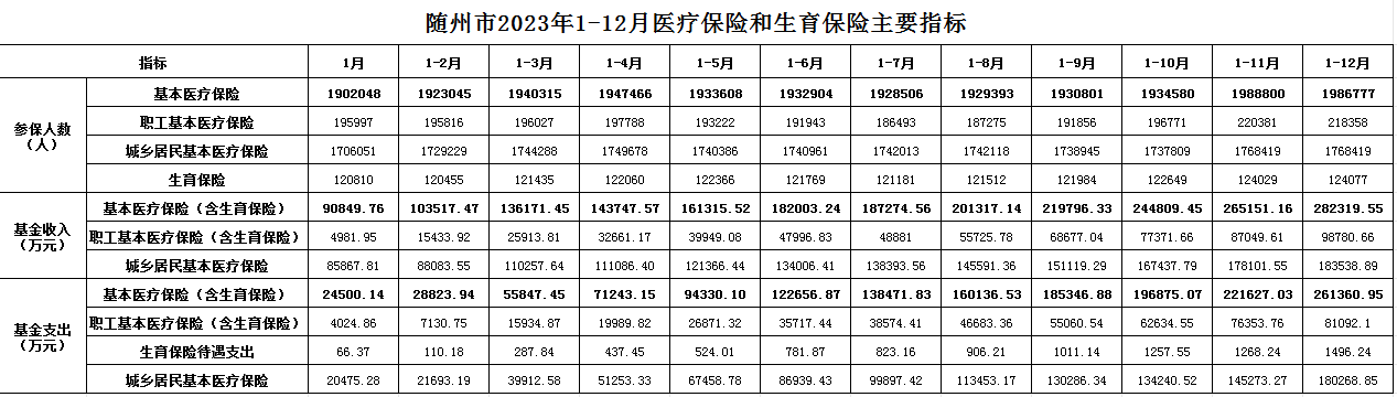 隨州市2023年1-12月醫療保險和生育保險主要指標