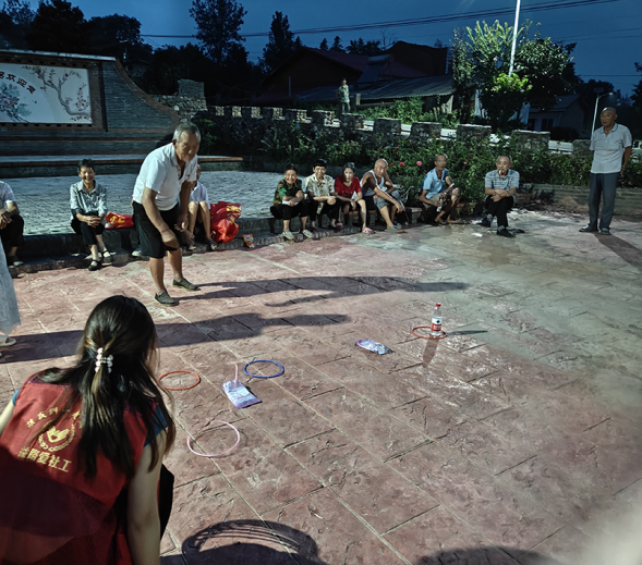 為營造更加濃厚的節日氛圍,豐富老年人的精神生活,增加節日的趣味性,當日晚上,社工和志愿者還在喻家灣村廣場舉辦了一場中秋趣味聯歡活動。活動現場,老人們歡聚一堂,參與有趣的套圈游戲。在志愿者的指導下,老人們用常年勞作的手,笨拙而新奇地嘗試套圈。大家躍躍欲試,爭先恐后,認真地瞄準目標。不一會兒,厲害的爺爺奶奶們都收獲了或多或少的實用獎品,開心得像個孩子,綻放出會心的笑容。