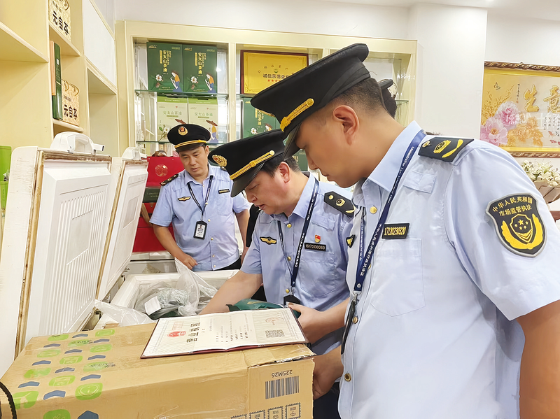 9月5日至6日,廣水市市場監(jiān)督管理局和信陽市浉河區(qū)市場監(jiān)督管理局對茶葉市場實(shí)施年度跨省聯(lián)合檢查。執(zhí)法人員從100余家不同信用風(fēng)險等級的茶葉經(jīng)營者中,隨機(jī)抽檢了25家市場主體。圖為執(zhí)法人員對商家進(jìn)行檢查。