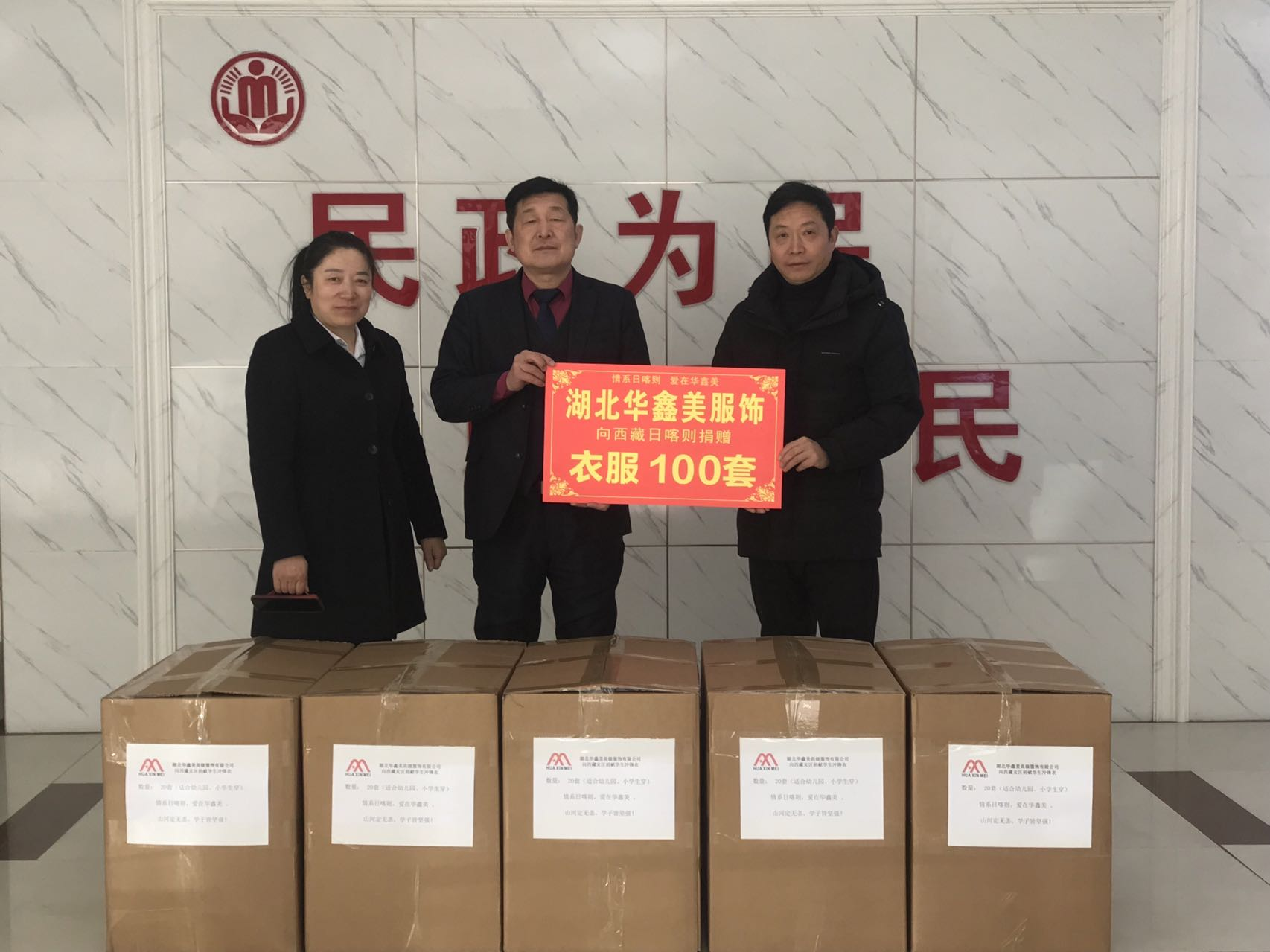 圖為湖北華鑫美高級(jí)服飾有限公司通過市慈善總會(huì)向?yàn)?zāi)區(qū)捐贈(zèng)100套沖鋒衣。(姜翔)