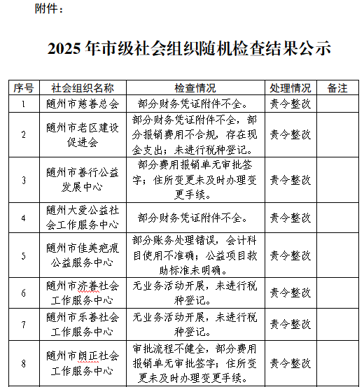 根據民政部《社會組織抽查暫行辦法》、省人民政府辦公廳《關于全面推行“雙隨機、一公開”監管工作的通知》和《關于開展2025年市級社會組織隨機抽查的通知》要求,現將2025年市級社會組織“雙隨機、一公開”檢查結果予以公示(見附件)。