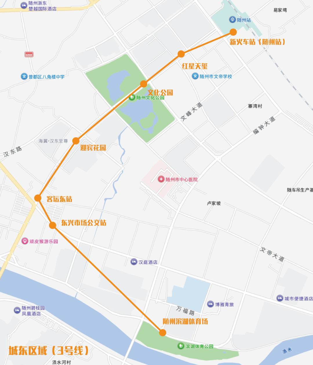 線路走向:新火車站(隨州站)→文帝學校(迎賓大道)→文化公園→迎賓花園→客運東站→東興市場(交通大道)→濱湖體育場
