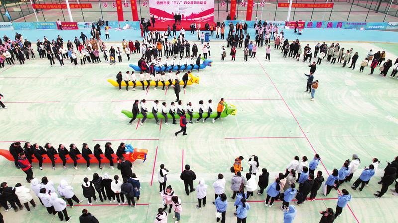 3月6日,我市舉辦慶“三八”“運動促發(fā)展巾幗展風采”婦女趣味運動會。圖為旱地龍舟比賽現(xiàn)場。?