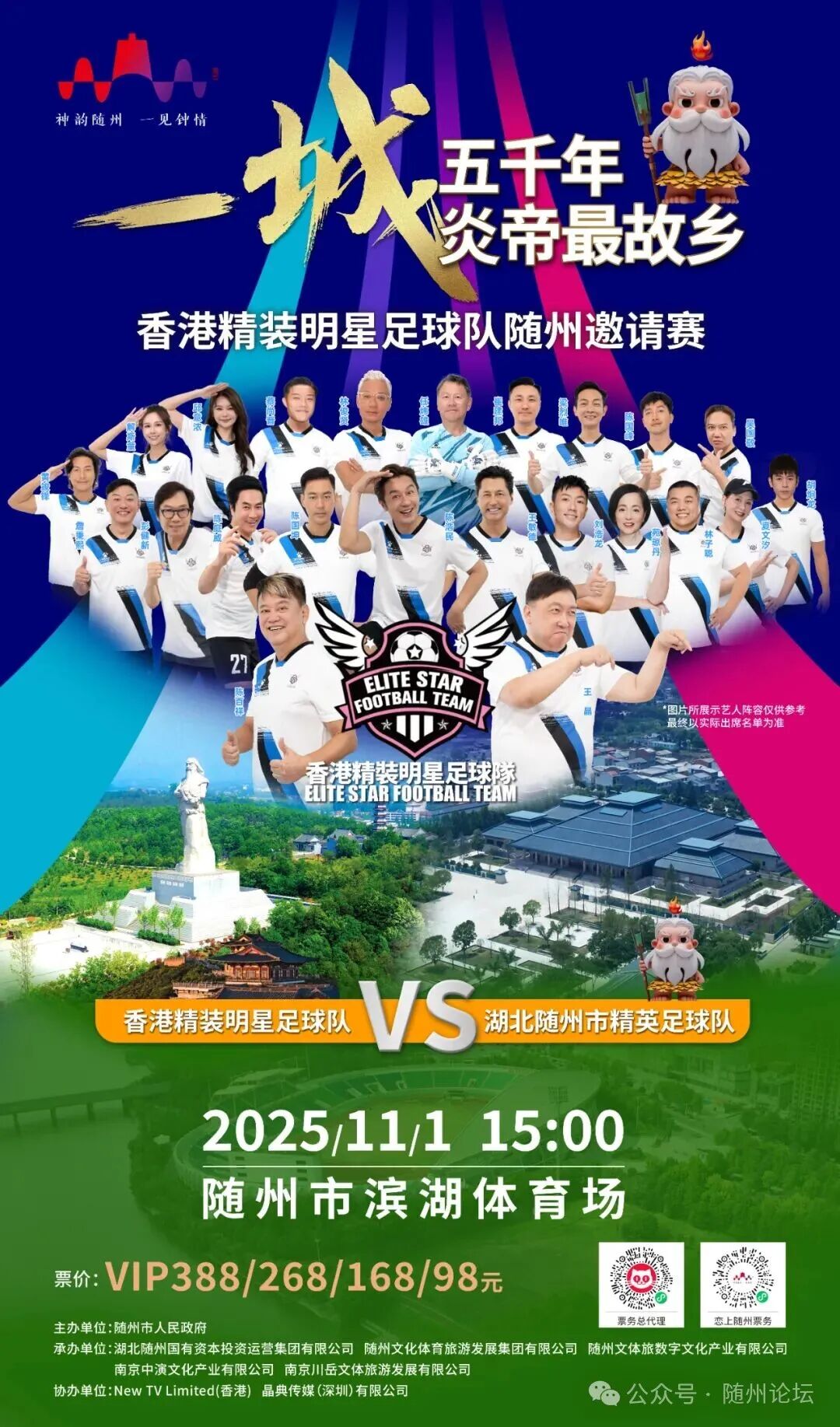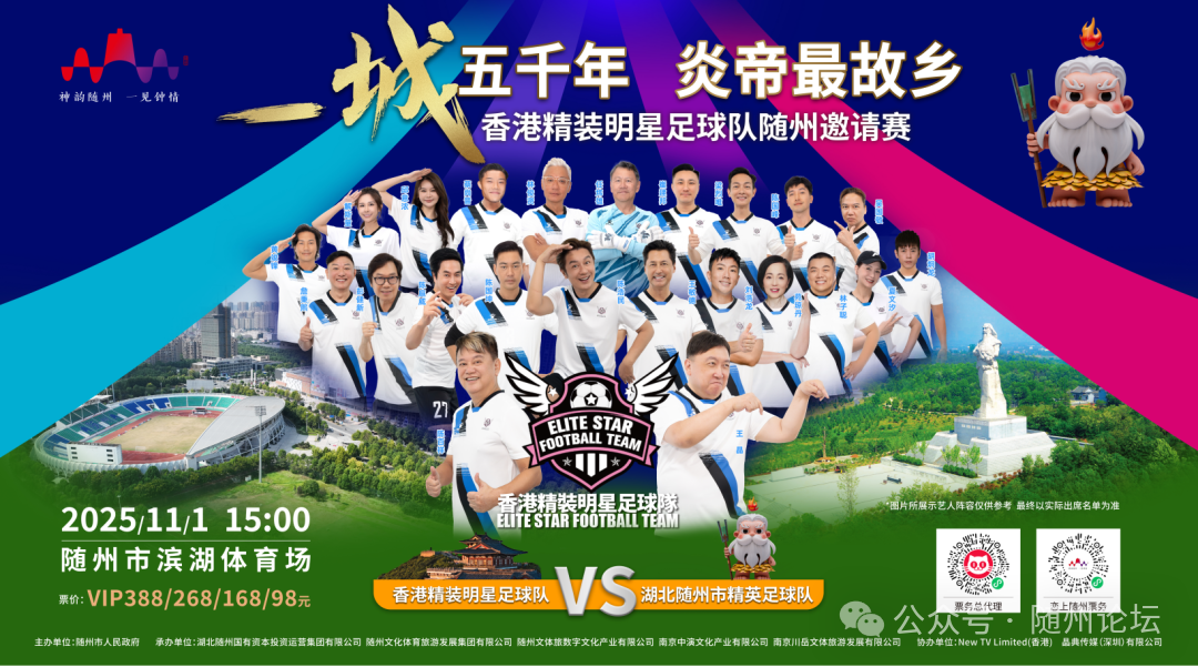 11月1日15:00,香港精裝明星足球隊將應邀蒞臨隨州市濱湖體育場,與湖北隨州市精英足球隊進行友誼賽。擬邀由陳百祥、王晶、陳浩民等藝人組成的明星隊伍(以實際到場為準),以“神韻隨州 一見鐘情”為主題,為市民獻上一場體育與文藝交相輝映的全民盛宴。