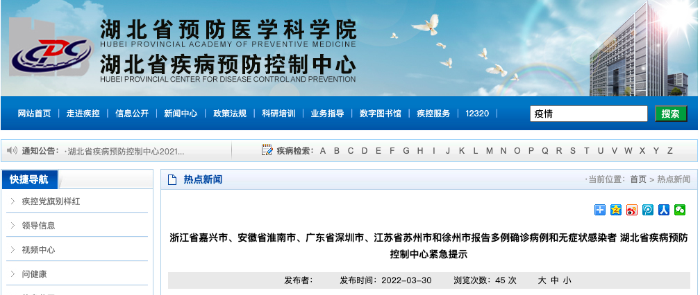 浙江省嘉興市、安徽省淮南市、廣東省深圳市、江蘇省蘇州市和徐州市報告多例確診病例和無癥狀感染者 湖北省疾病預防控制中心緊急提示