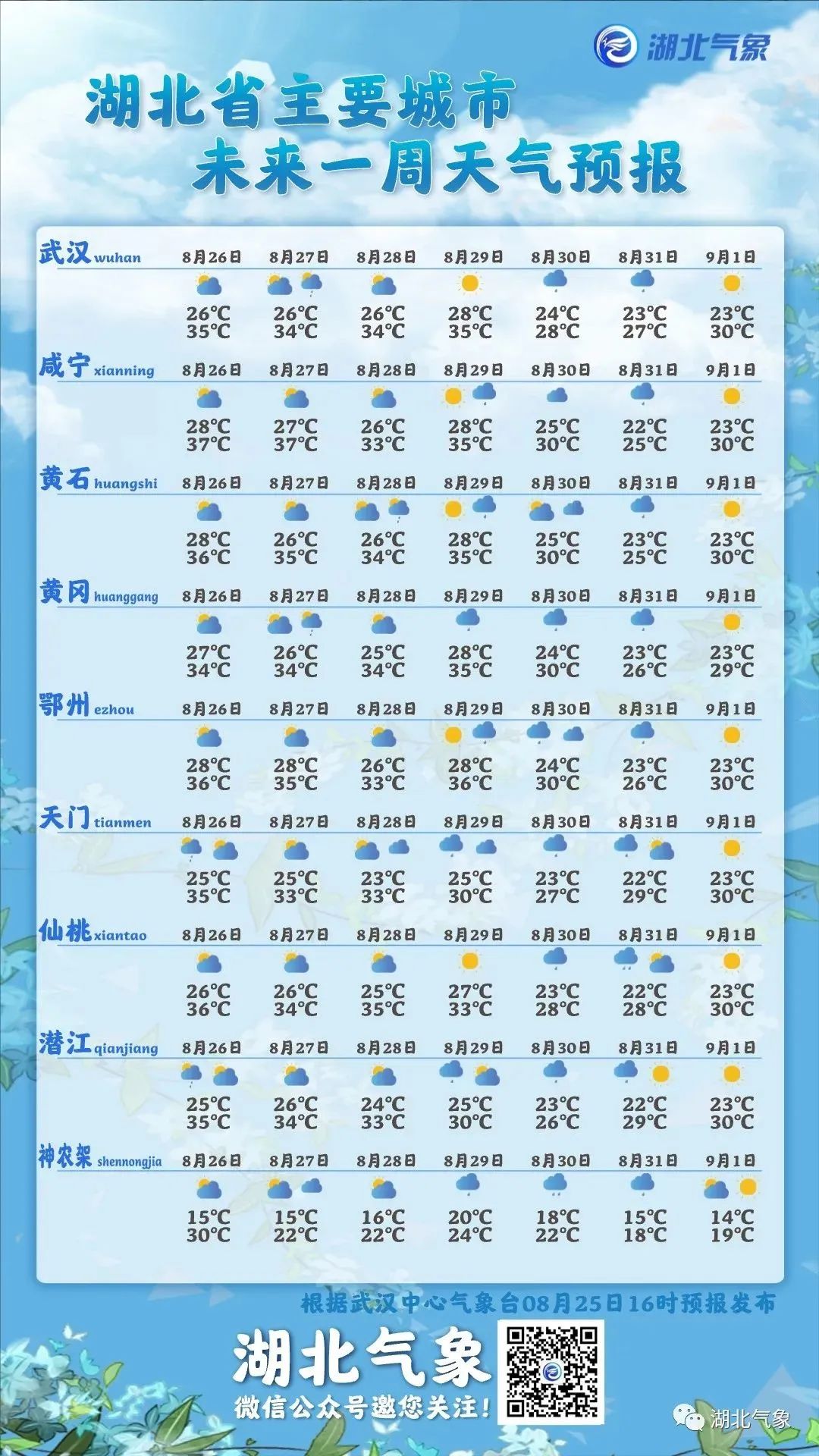 最高氣溫:鄂西北26~29℃;其他地區33~36℃