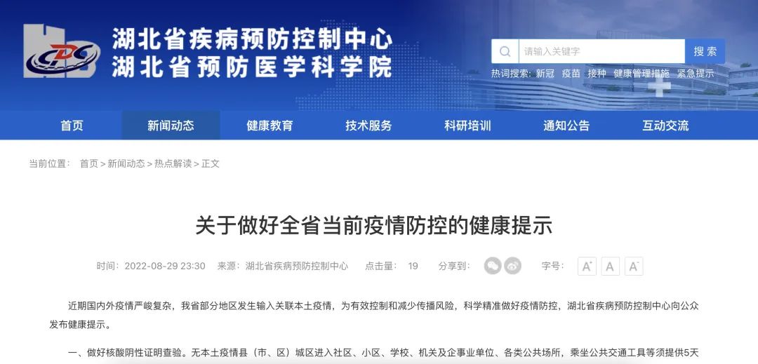 近期國內外疫情嚴峻復雜,我省部分地區發生輸入關聯本土疫情,為有效控制和減少傳播風險,科學精準做好疫情防控,湖北省疾病預防控制中心向公眾發布健康提示。