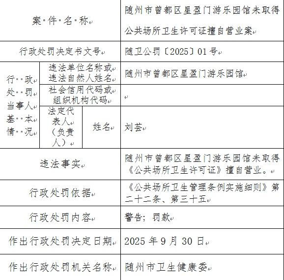 曾都區(qū)星盈門游樂園館衛(wèi)生行政處罰案