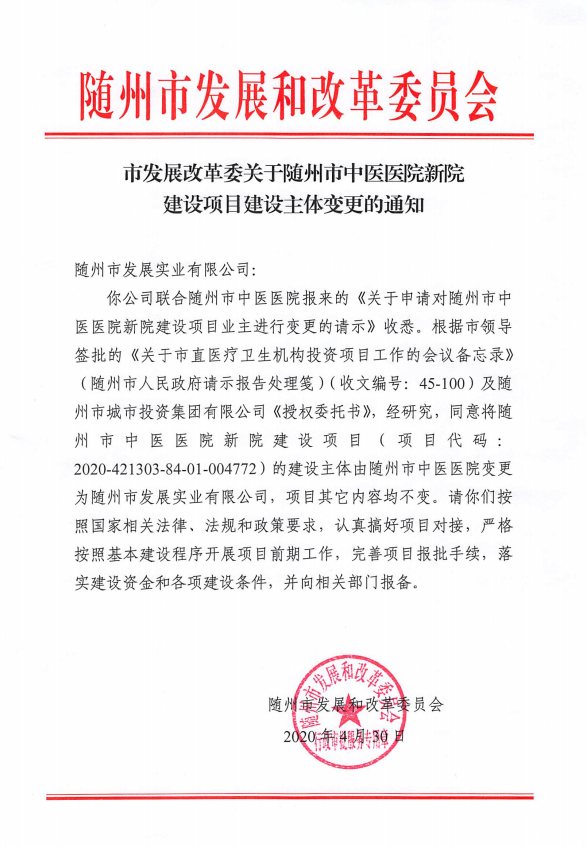 市發展改革委關于隨州市中醫醫院新院建設項目建設主體變更的通知