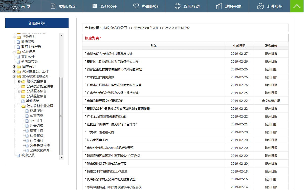 4.推進社會公益事業建設領域信息公開。在市政府門戶網站開設“社會公益事業建設”重點版塊,加大對脫貧攻堅、社會救助、社會福利、社會組織、教育、醫療衛生、環境保護、災害事故救助和公共文化體育等領域的政府信息公開力度,全年共發布政府信息1976條。