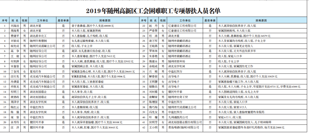 根據(jù)隨工辦[2019]15號文件《關(guān)于開展全市困難職工調(diào)查摸底工作的通知》的文件精神,全力做好隨州高新區(qū)困難職工幫扶工作,高新區(qū)工會共籌措31.95萬元。擬對高新區(qū)工會困難幫扶系統(tǒng)中建檔的42名困難職工予以救助。現(xiàn)將高新區(qū)擬救助困難職工、救助標(biāo)準(zhǔn)予以公示。