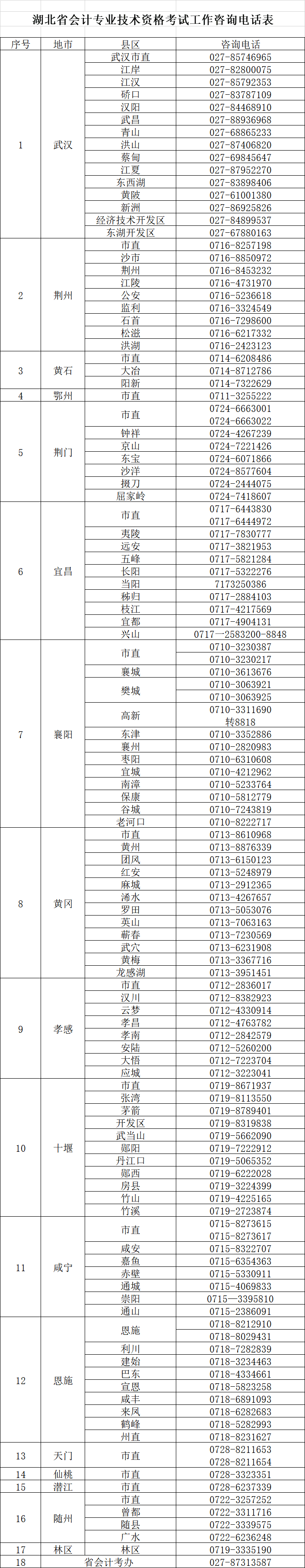 湖北省會計專業(yè)技術(shù)資格考試工作咨詢電話表